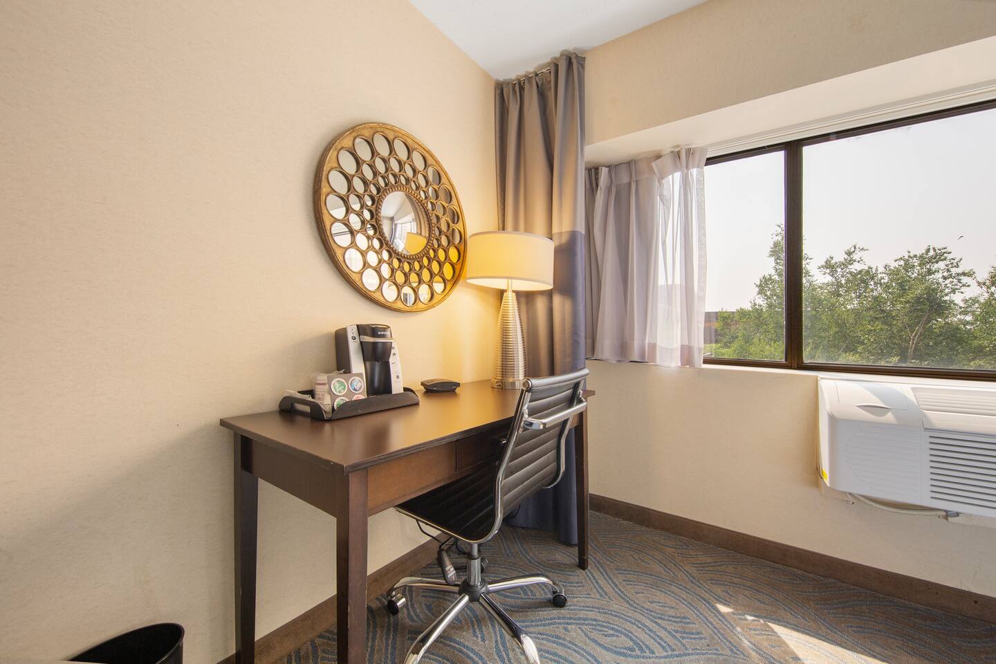 Dual queen suite with access to pool, hot tub, sauna, gym, lounges, and outdoor lounge space. Just minutes from Mall of America, MSP Airport, and the light rail to downtown. Features two plush queen beds, work desk, and kitchenette with mini-fridge, microwave, and coffee maker. Enjoy free airport shuttle, on-site dining, and all the amenities for a relaxing and convenient stay.