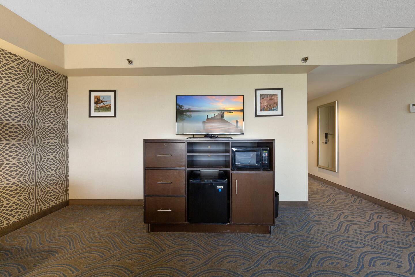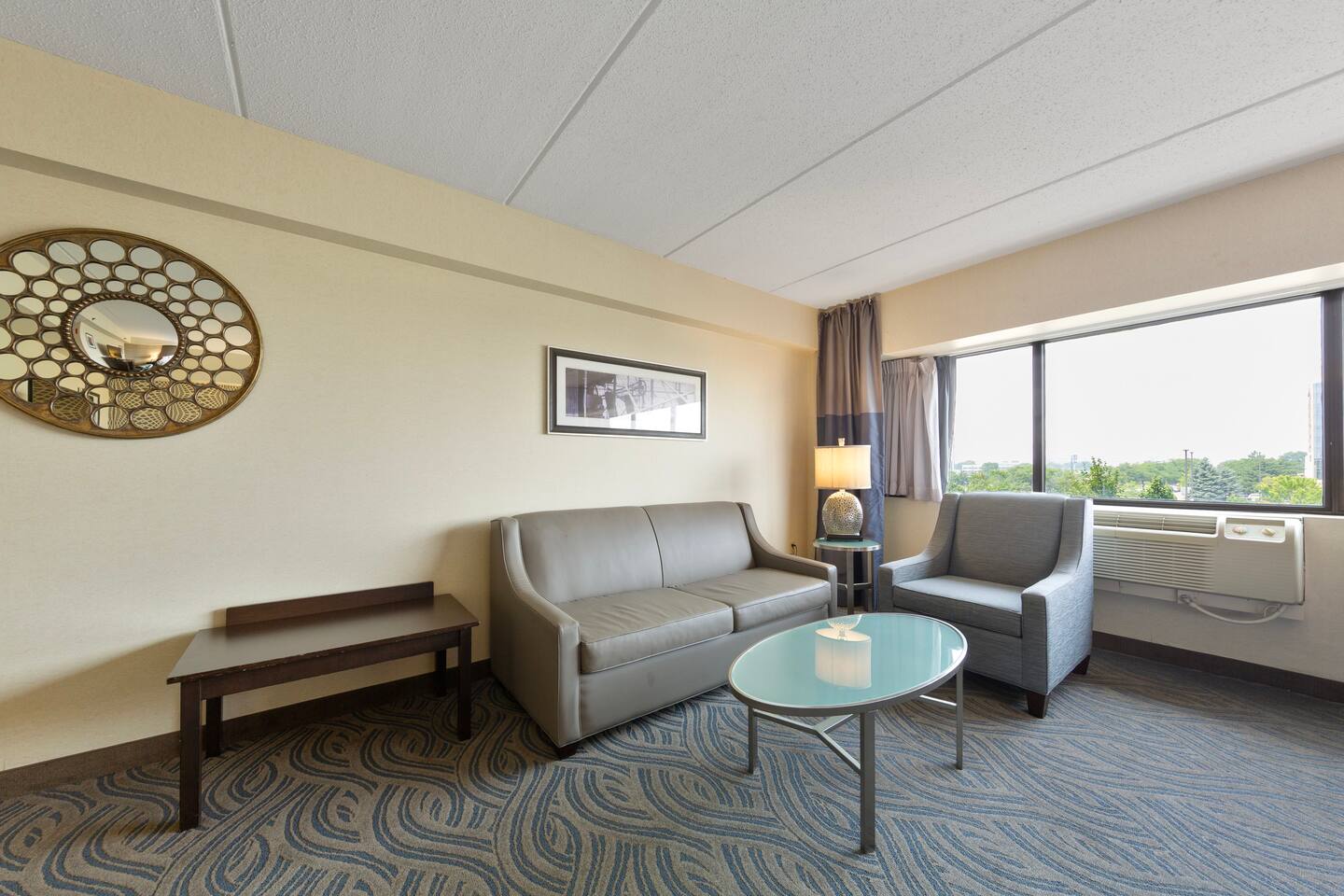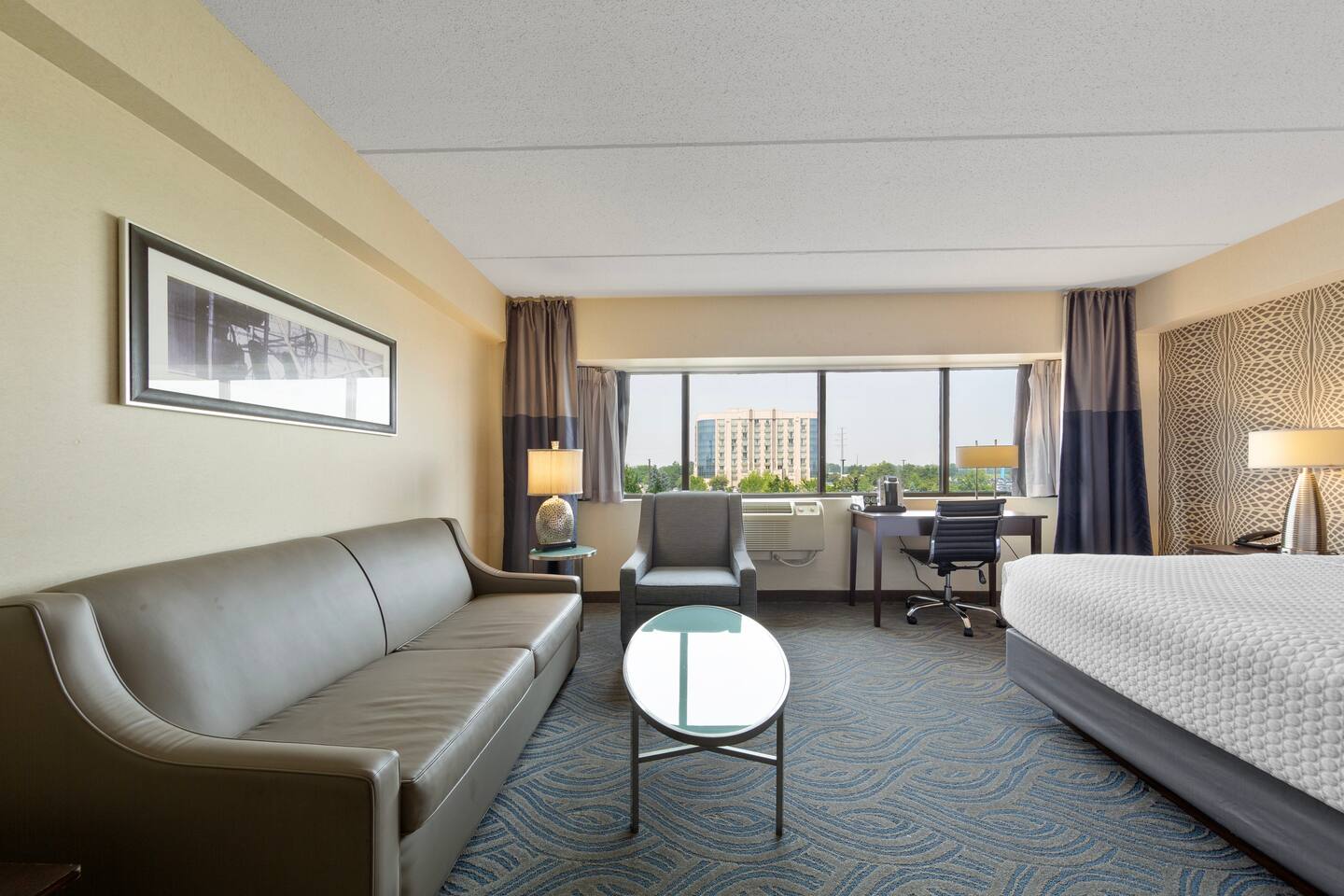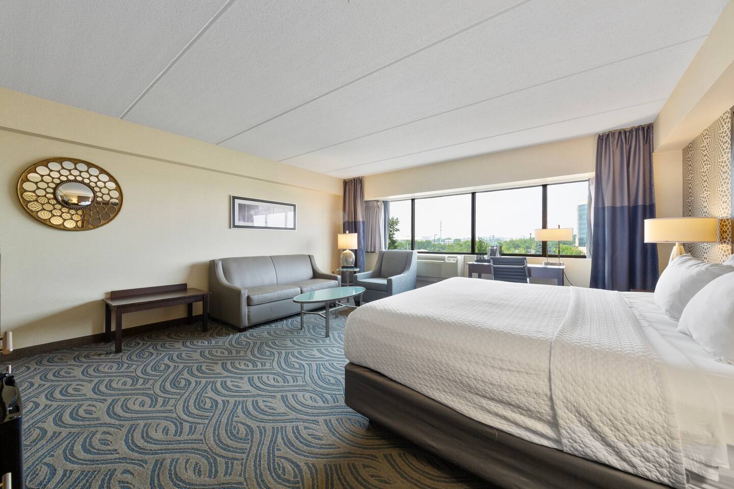 Spacious king suite with access to pool, hot tub, sauna, gym, lounges, and outdoor lounge space. Just minutes from Mall of America, MSP Airport, and the light rail to downtown. Features a plush king bed, sitting area, work desk, and kitchenette with mini-fridge, microwave, and coffee maker. Enjoy free airport shuttle, on-site dining, and all the amenities for a relaxing and convenient stay.